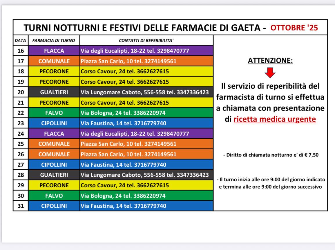 Turni Farmacie di Gaeta- FINO AL 31 OTTOBRE 2025