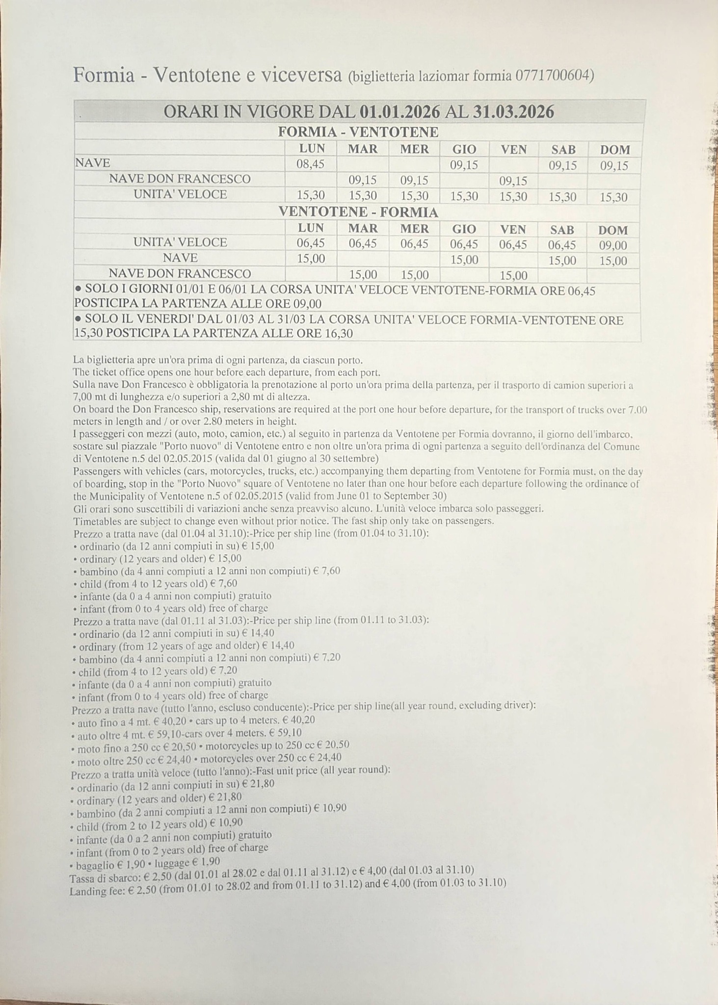 I collegamenti da Form ia per Ponza e Ventotene sono curati da LAZIOMAR (Compagnia di Trasporto Marittimo) Gli orari allegati sono validi FINO AL 31 MARZO 2026 aggiornamenti e contatti: http://www.laziomar.it/orari-e-destinazioni