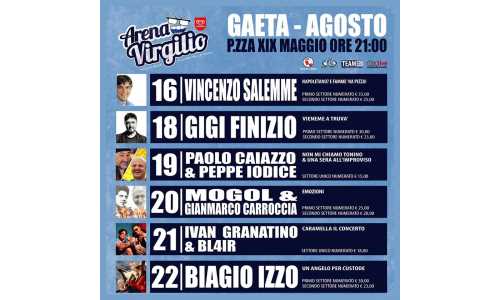 Vincenzo Salemme,Gigi Finizio, Paolo Caiazzo & Peppe Iodice, Mogol e Gianmarco Carroccia, Ivan Granatino & BL4IR, Biagio Izzo. Questi i nomi dei protagonisti dell'estate gaetana. Tutto pronto per l'Arena Virgilio, a Gaeta, in Piazza XIX maggio - Piazza Mons. Di Liegro, dal 16 al 22 agosto, ore 21!