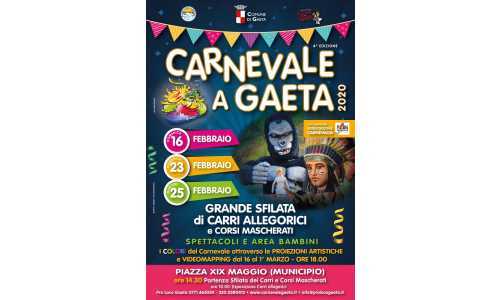 CARNEVALE A GAETA... 16, 23 e 25 febbraio 2020 Carri allegorici, corsi mascherati, area bimbi, animazione e grandi spettacoli! Videomapping e proiezioni artistiche nelle piazze e nei vicoli della città dal 16 febbraio al 1 marzo 2020.
