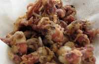 600 gr di calamaretti, un po' di farina, olio, sale. Mettete su un fuoco vivace una padella in rame, con poco olio. Quando l’olio è molto bollente versateci i calamaretti infarinati e con una forchetta schiacciateli e compattateli contro il fondo della padella, in modo da fare una schiacciata. Cotti da un lato, li dovete capovolgere come una frittata. E’ questa l’operazione più difficile, attenti a non scottarvi con l’olio: prendete un piatto dello stesso diametro interno della padella, coprite i calanaretti, togliete la padella dal fuoco, e con un colpo secco capovolgetela, poi aggiungete nella teglia altro olio, e quando di nuovo frigge, fateci scivolare dentro la schiacciata di calamaretti. Suggerimenti: Si consiglia di effettuare "l’operazione votapiatto” sopra il lavandino onde eventuali gocce dell’olio di cottura cadano nello stesso. L’operazione votapiatto fatela con gli avambracci diretti verso il basso, è più facile perché l'eventuale olio di colatura non vi cade addosso. I calamaretti vanno ben asciugati prima d’infarinarli, altrimenti possono scoppiettare durante la cottura. Variante: Potete utilizzare anche le “capetroppole”.